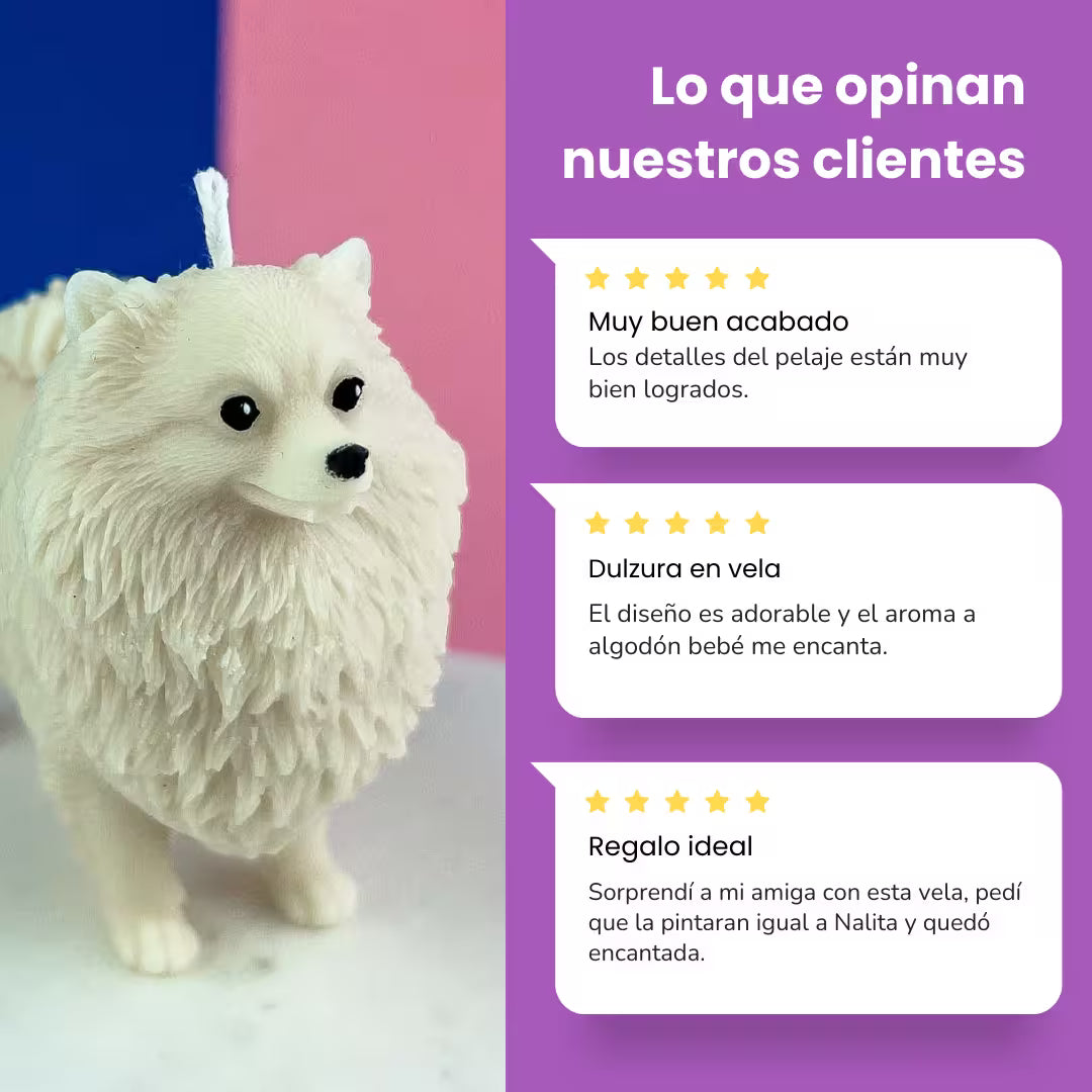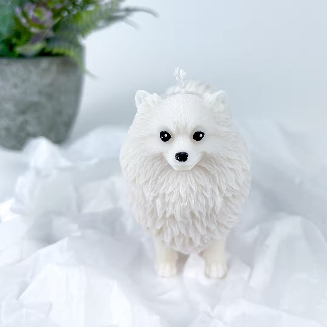 Vela Pomerania parado en 4 patas, perfecta para decorar con ternura y aroma acogedor cualquier espacio.